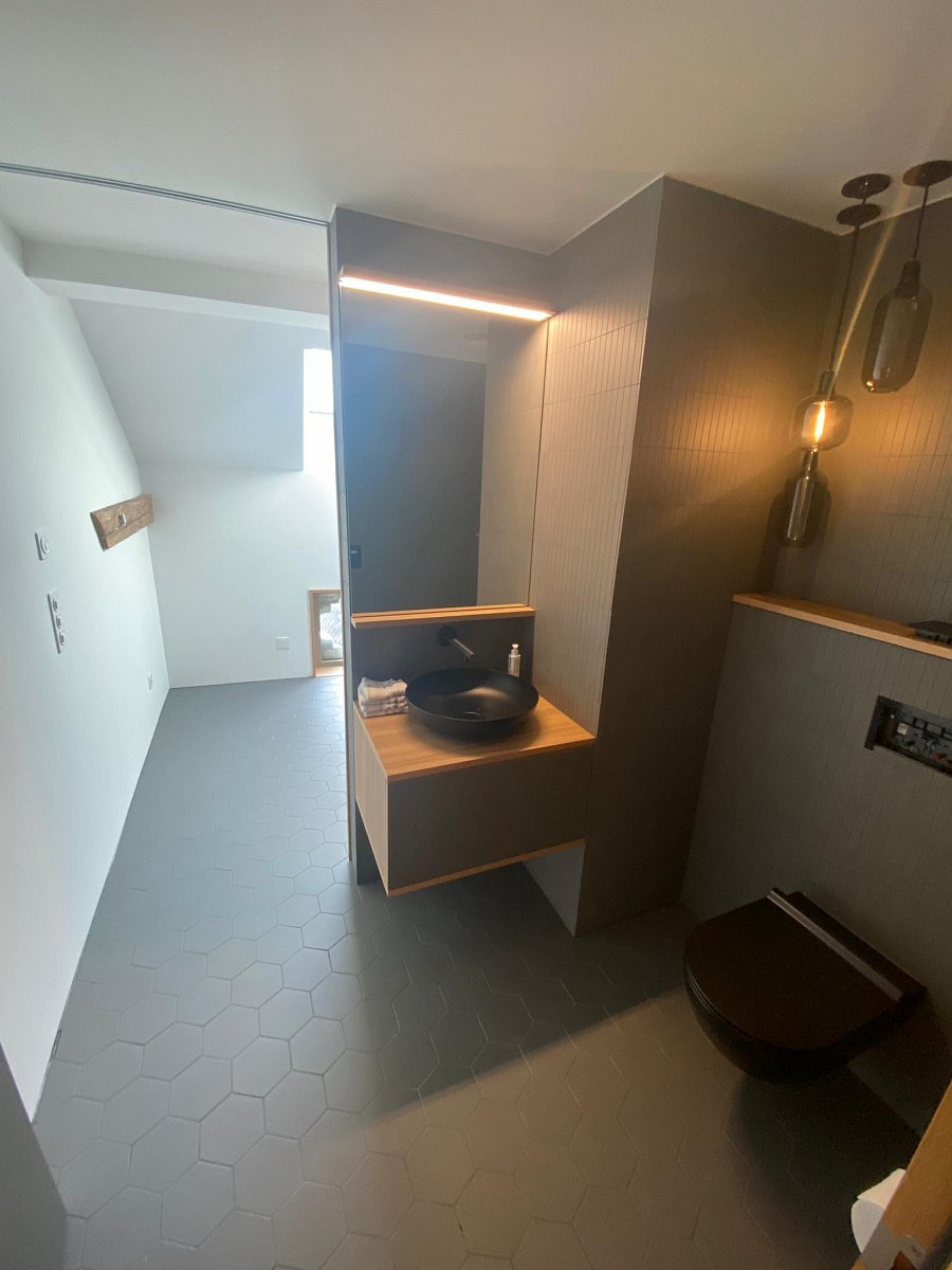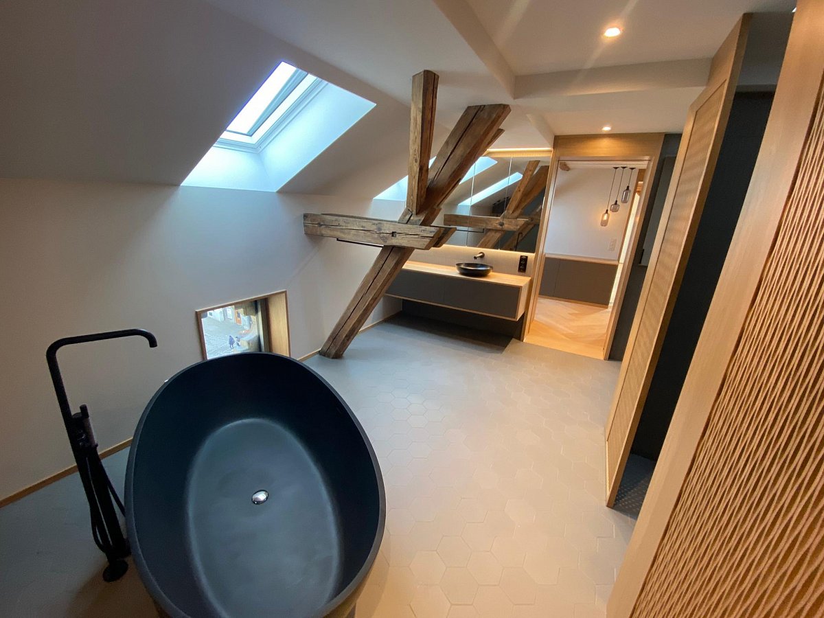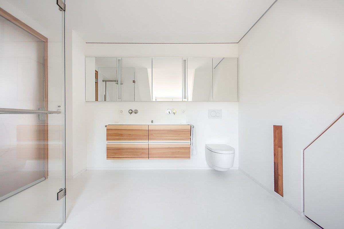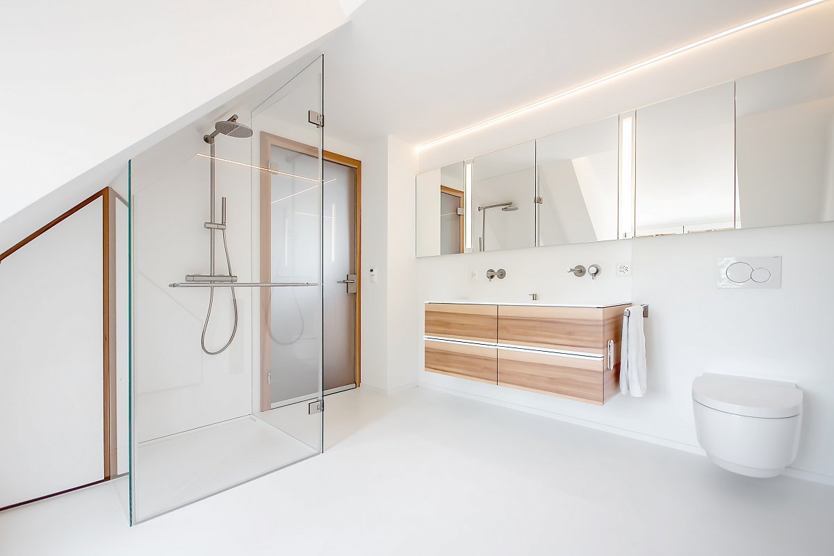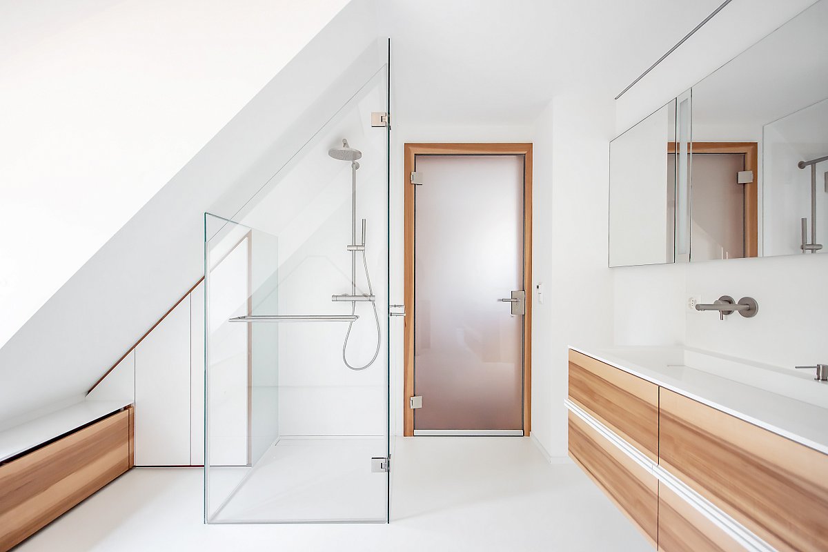 Mit wenigen Akzenten und aus Holz wurde dieses Bad stilvoll und schlicht gestaltet. Dennoch ist es mit viel Liebe zu Details durchdacht und geplant worden. Jede noch so kleine Nische wurde genutzt, als Schrank, Sitzbank mit integrierten Wäscheschubladen, Estrichteil etc. Sogar der WC-Zubehör (WC-Besen und -Papier wurde in einem Holzschrank neben der Toilette "versteckt".