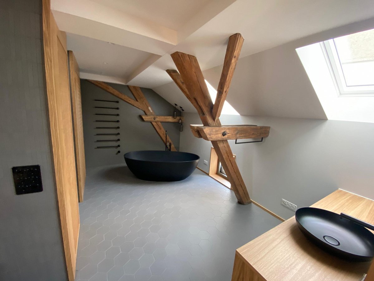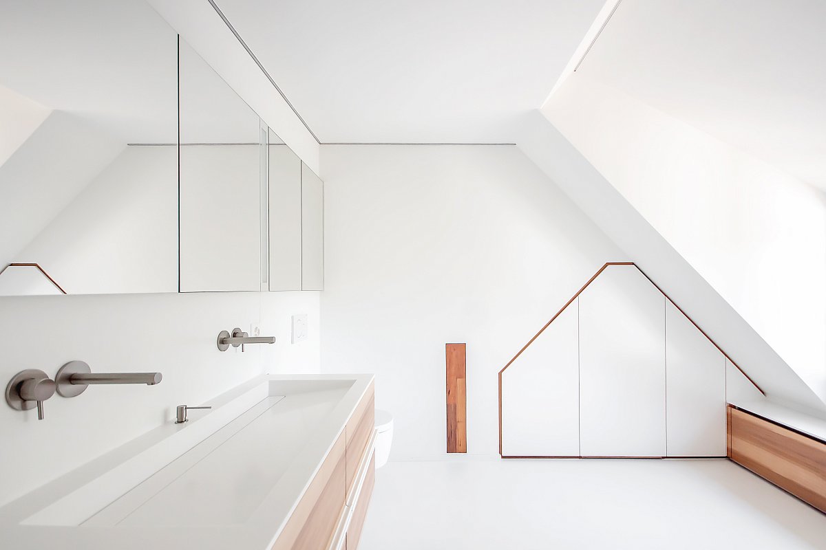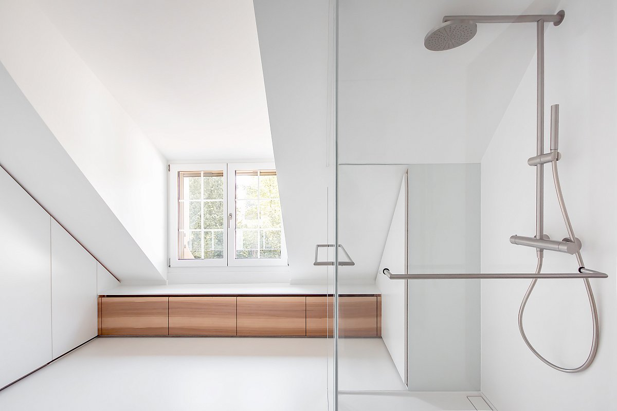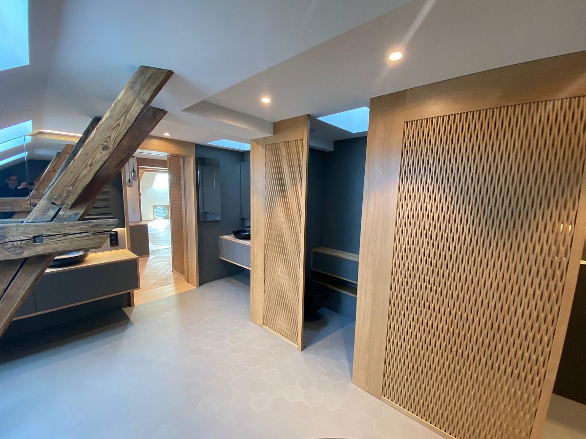 Mit wenigen Akzenten und aus Holz wurde dieses Bad stilvoll und schlicht gestaltet. Dennoch ist es mit viel Liebe zu Details durchdacht und geplant worden. Jede noch so kleine Nische wurde genutzt, als Schrank, Sitzbank mit integrierten Wäscheschubladen, Estrichteil etc. Sogar der WC-Zubehör (WC-Besen und -Papier wurde in einem Holzschrank neben der Toilette "versteckt".
