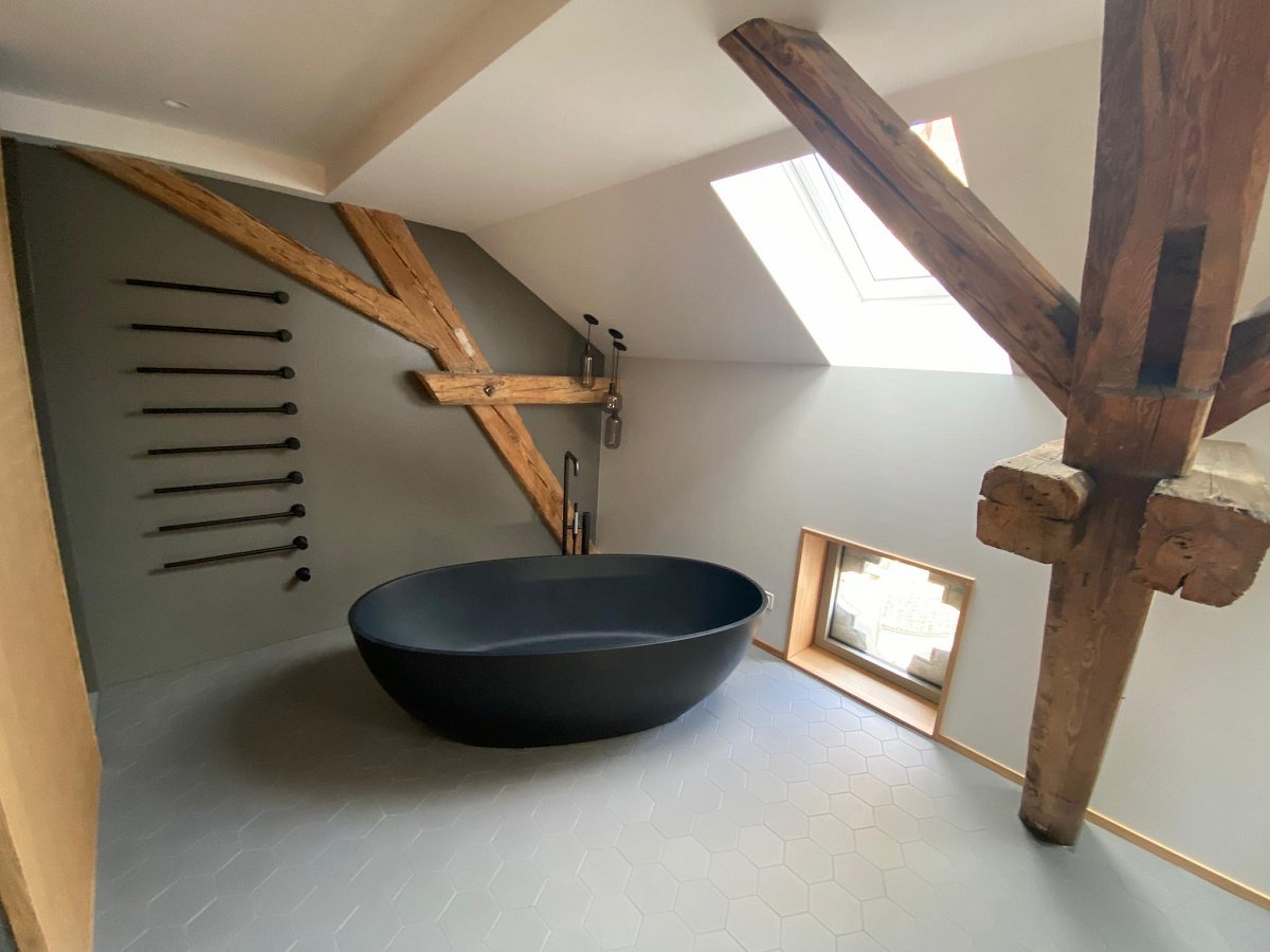 Wunderbar harmonisch und elegant, das Bad in Kombination mit Schwarz und Holz. Die Holzelemente sind in der hellen Wabenkonstruktion eine perfekte Ergänzung zu den dunklen Elementen der Badelandschaft.