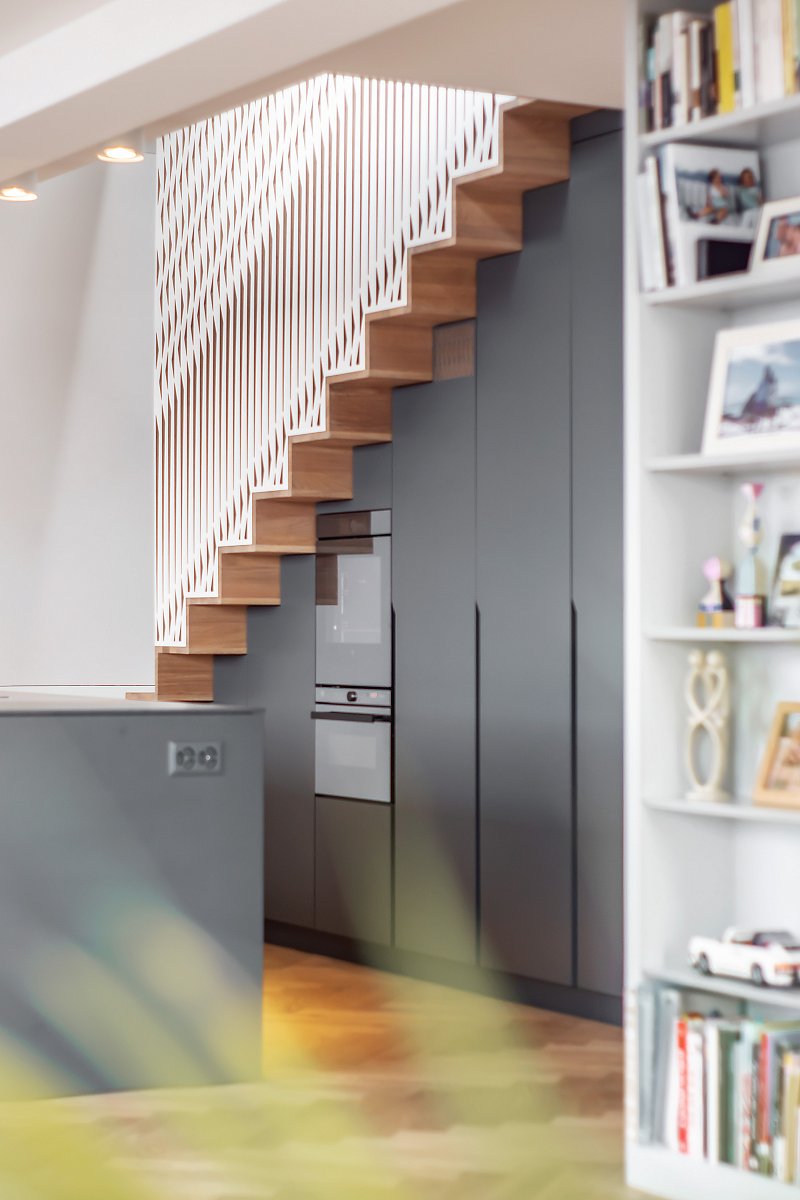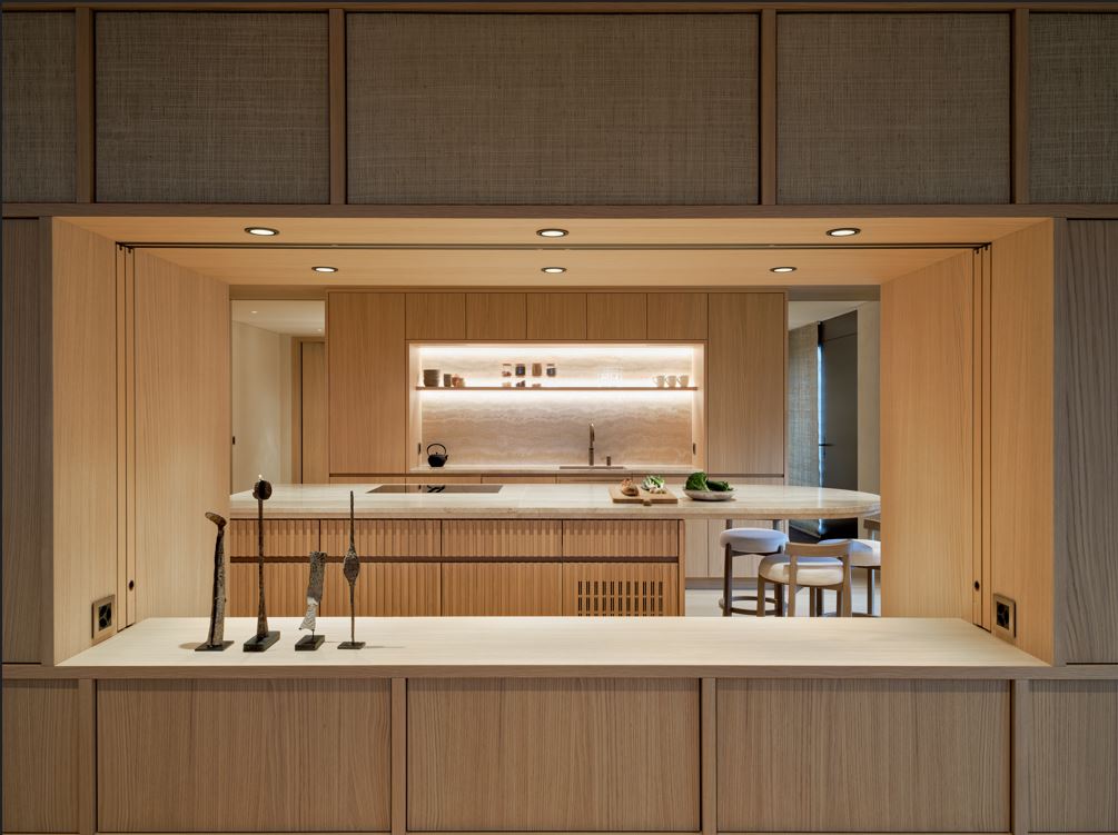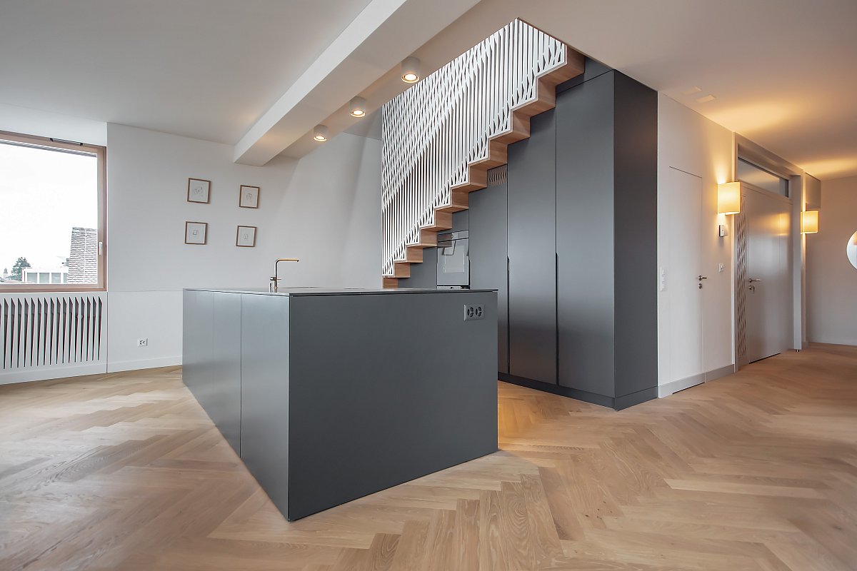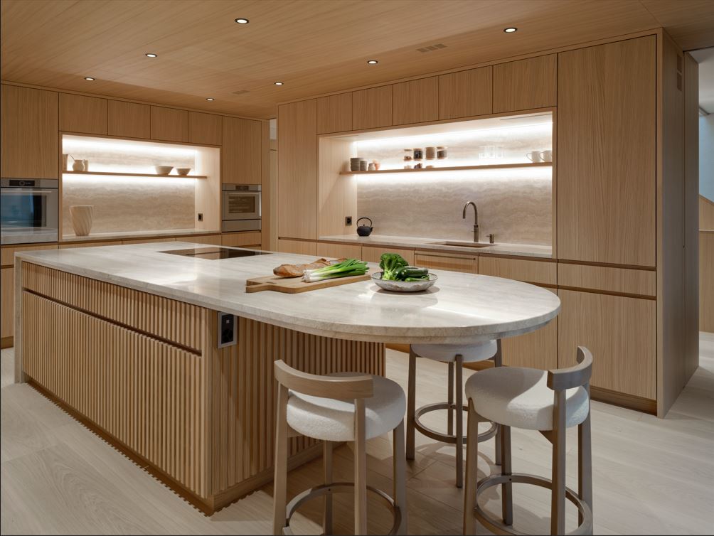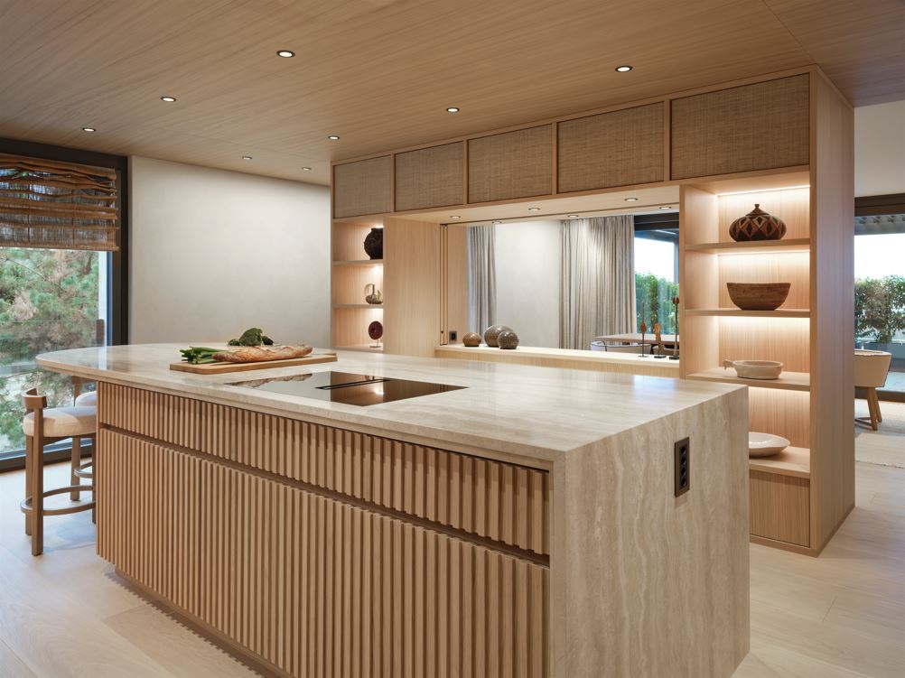 Diese Küche besticht durch schlichte Eleganz und ist das Herzstück eines stilvollen Innenraums. Die Eiche in Lamellenoptik harmoniert perfekt mit den abgestimmten Seitenwänden und der Steinabdeckung. Eine praktische Schiebetür in der Küchenrückwand verbindet sie nahtlos mit dem Esszimmer, während Farben und Formen fließend zwischen den Räumen übergehen.