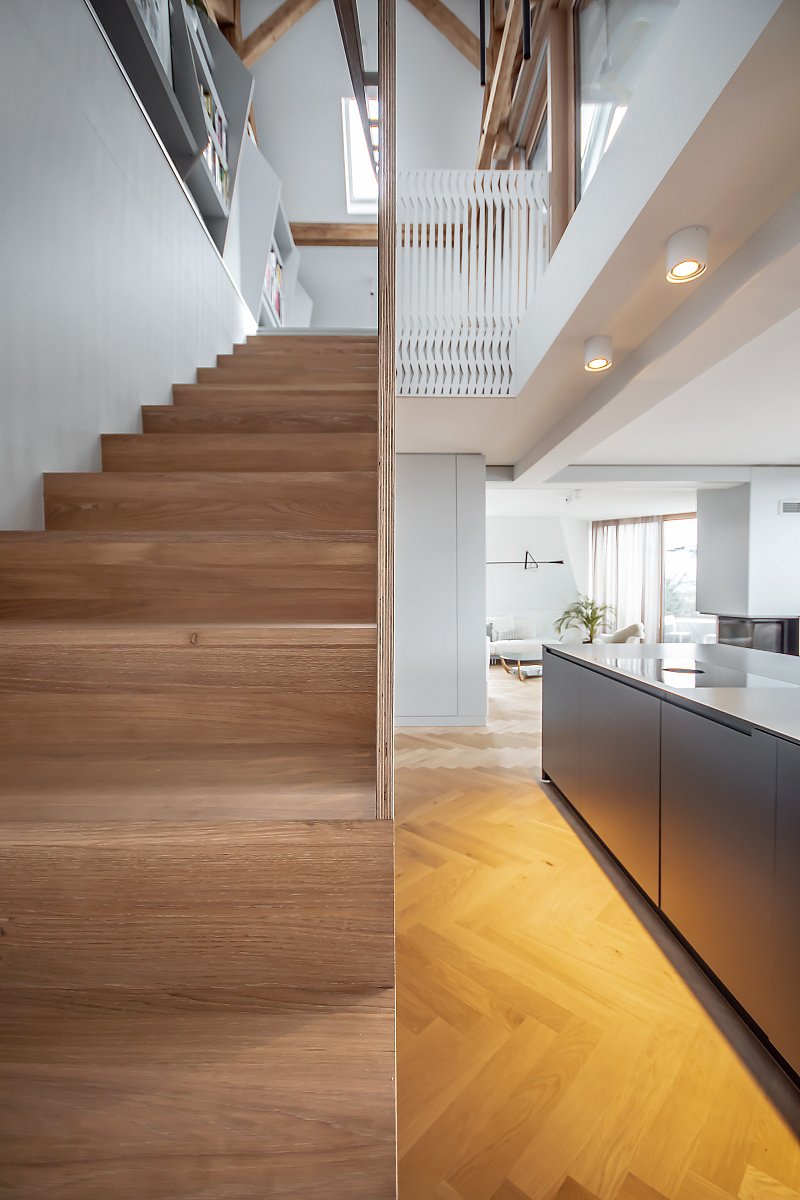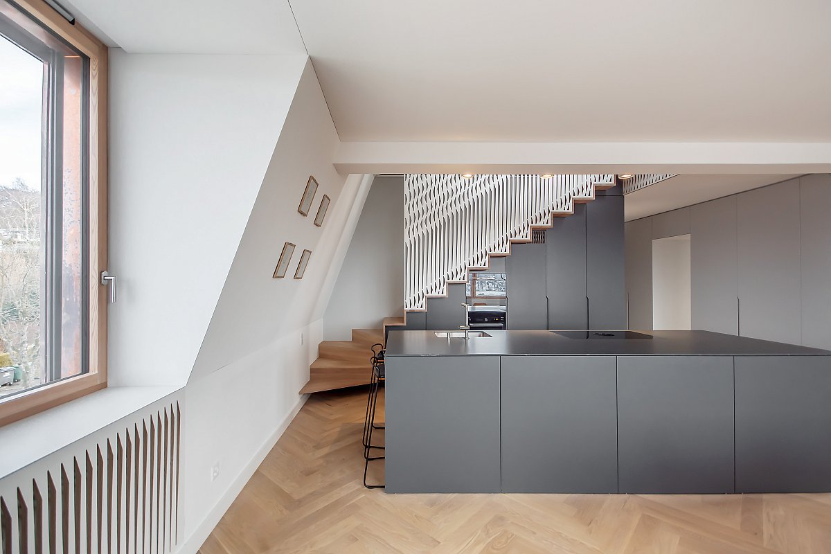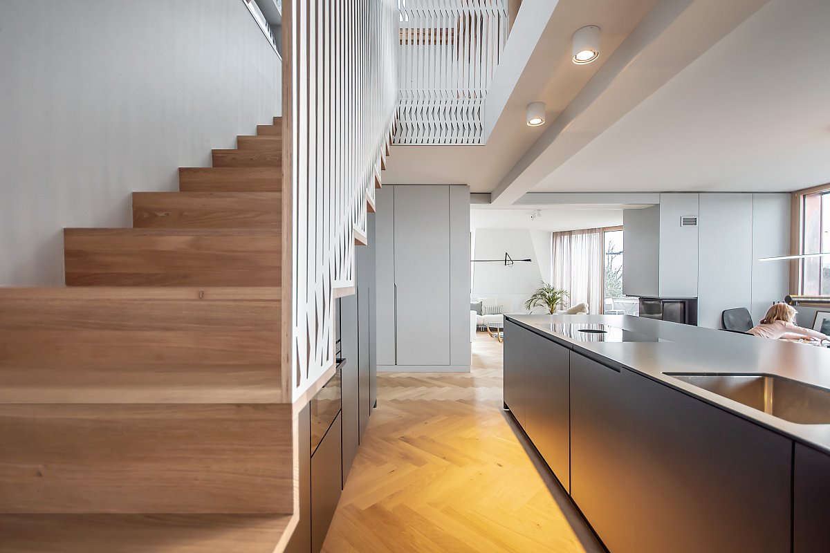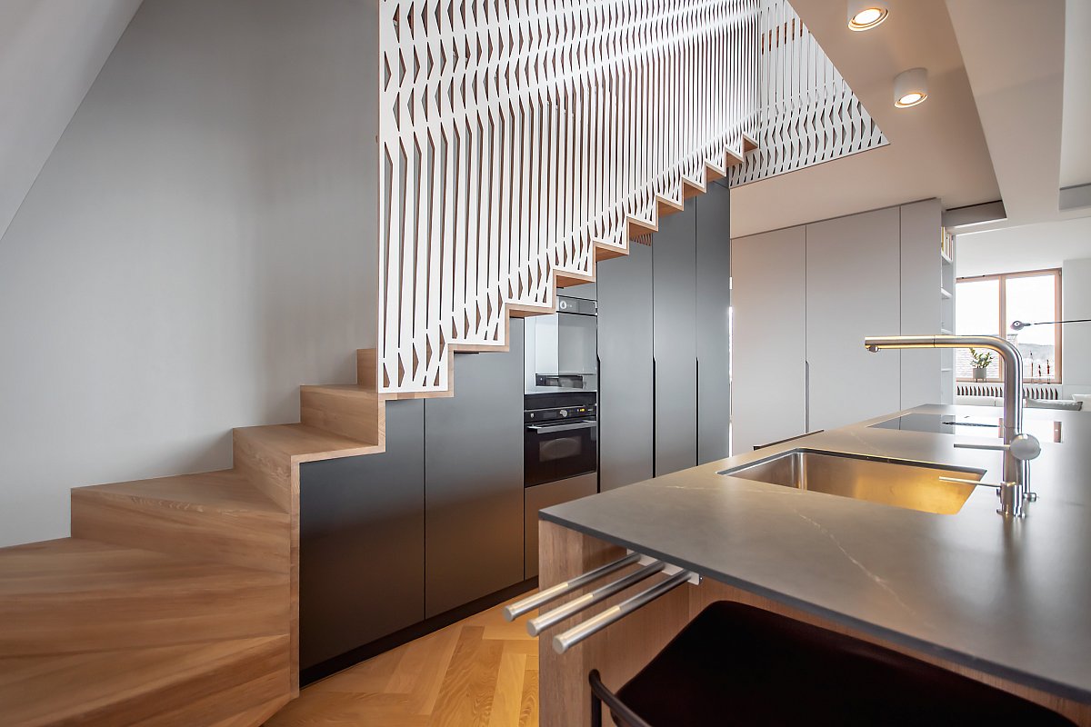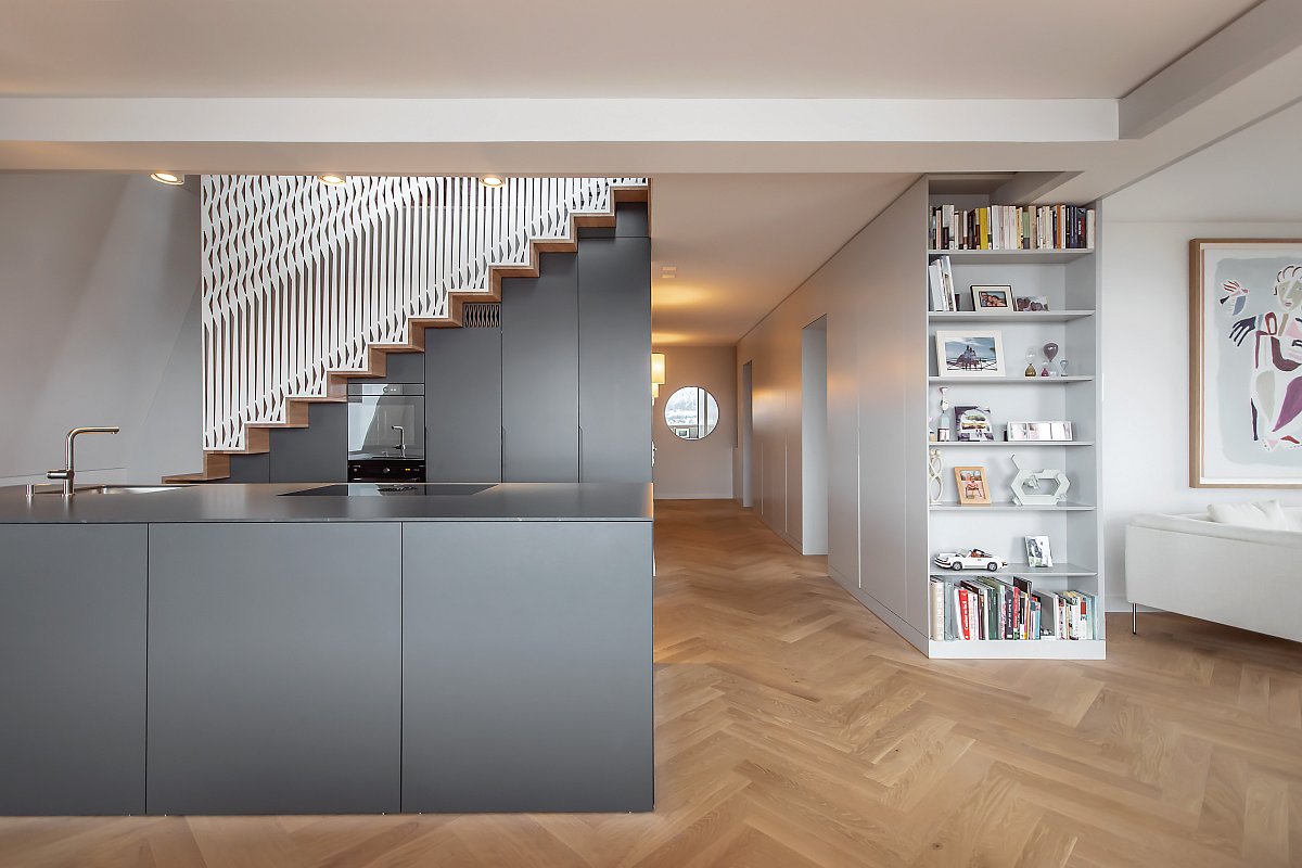 Diese Küche besticht durch schlichte Eleganz und ist das Herzstück eines stilvollen Innenraums. Die Eiche in Lamellenoptik harmoniert perfekt mit den abgestimmten Seitenwänden und der Steinabdeckung. Eine praktische Schiebetür in der Küchenrückwand verbindet sie nahtlos mit dem Esszimmer, während Farben und Formen fließend zwischen den Räumen übergehen.